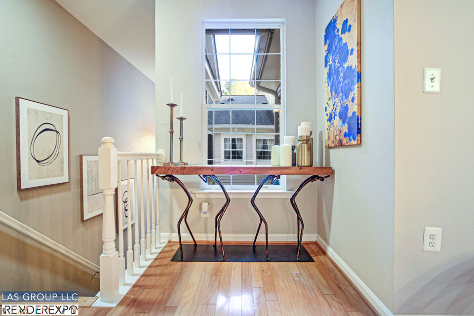 - A mixed-material console beneath the window near the stairs adds both an artistic and utilitarian element to the room.